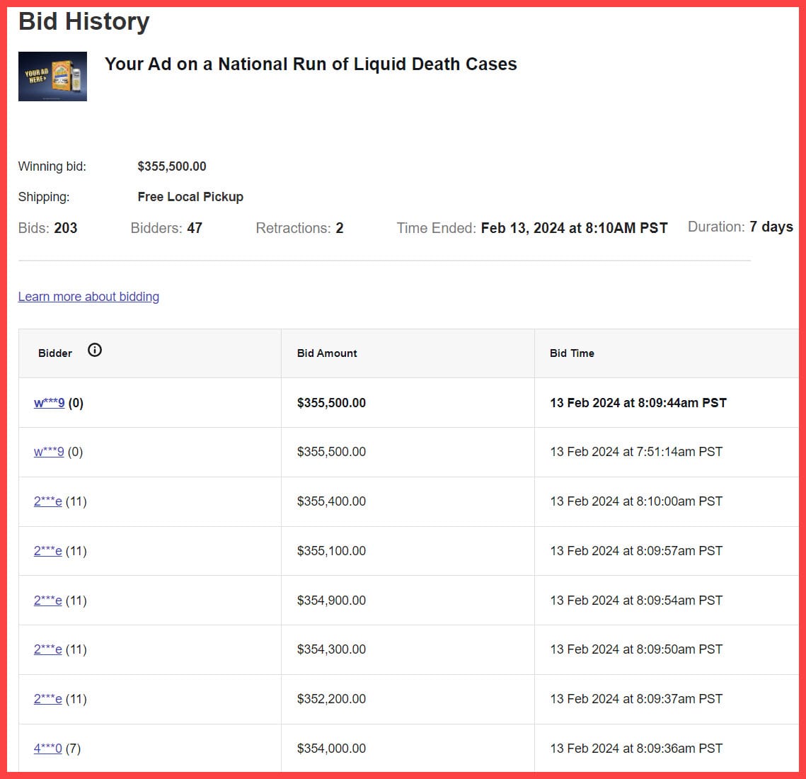 Others echoed the sentiment, saying if Liquid Death was aware that some bidders were running into "technical issues", they should have pulled the auction early instead of stringing it along.