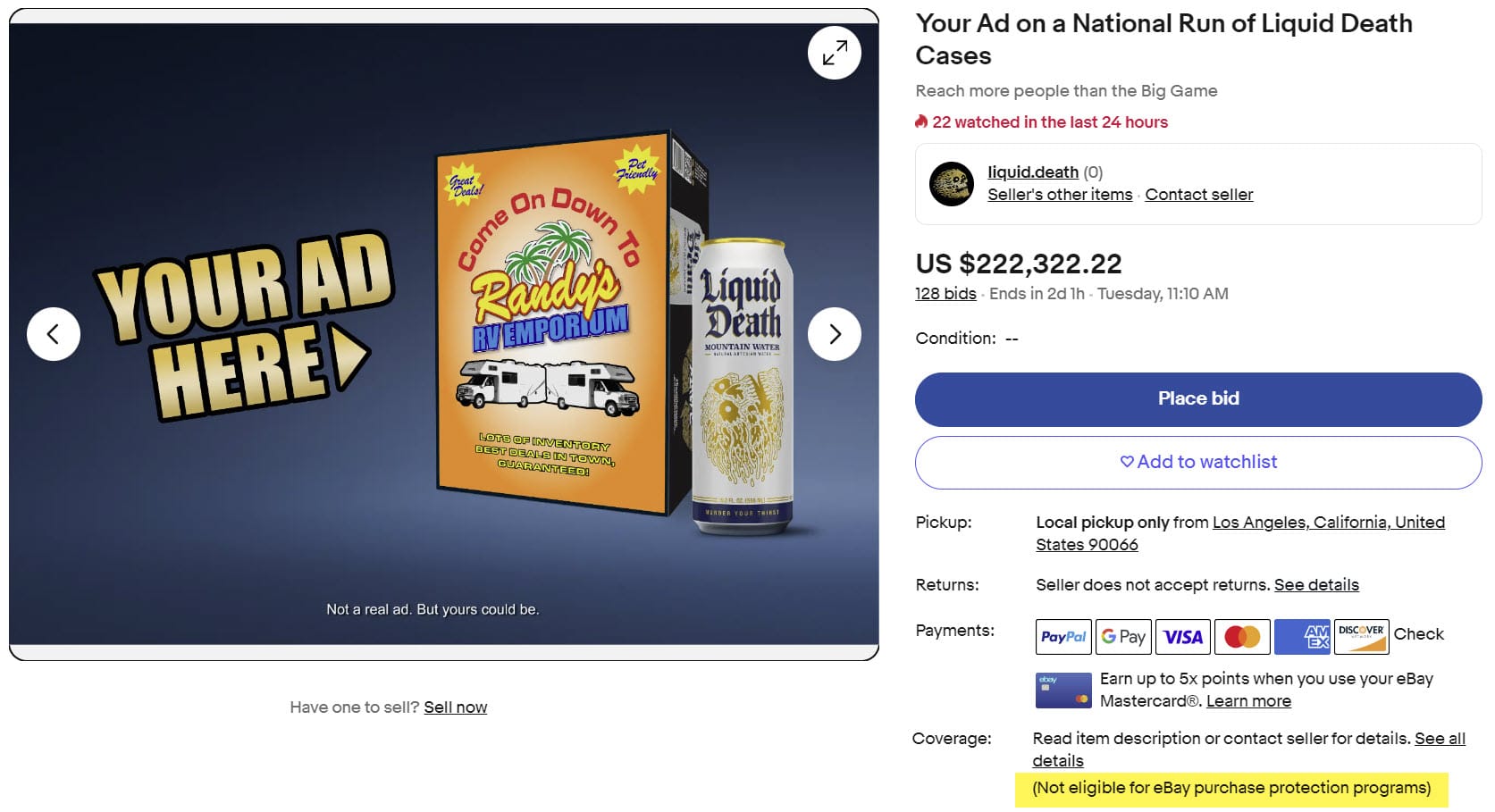 Whoever wins the big game today, eBay will likely come out the winner on this auction as not only do the stand to make Final Value Fee Commission on the sale (12.35% up to $2,500 and 2.35% on the portion of the sale over $2,500 if standard rates apply) - they are also making advertising money from one of Liquid Death's competitors, Smart Water, who has taken out a display ad on the listing for an undisclosed sum.