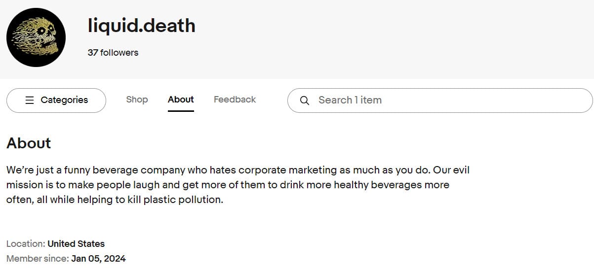 It's also interesting that Liquid Death was apparently able to bypass typical selling limits that would have likely prevented most zero feedback ~1 month old accounts from posting a listing like this.
