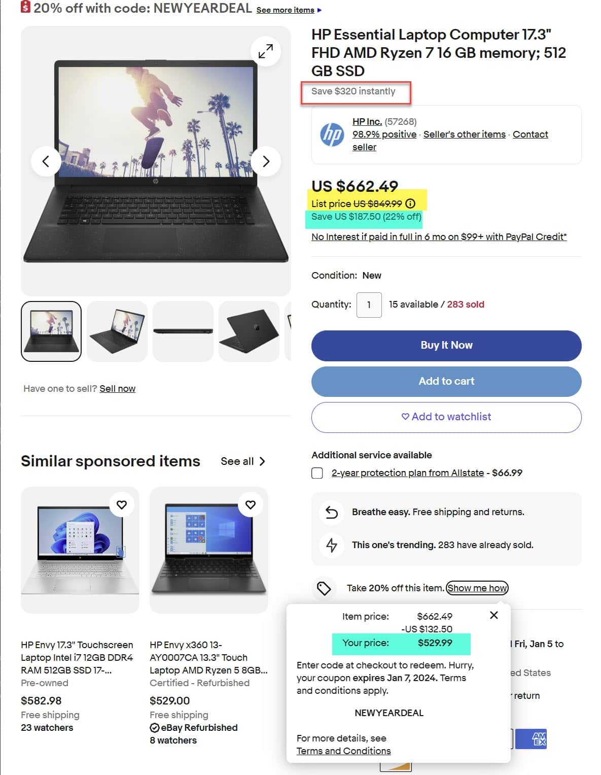 For example, this laptop sold directly by the official HP Inc. store on eBay claims you can "save $320 instantly" between the supposedly already marked down 22% price (from $849.99 to $662.49) and the "extra" 20% off coupon code, bringing the total down to $529.99.