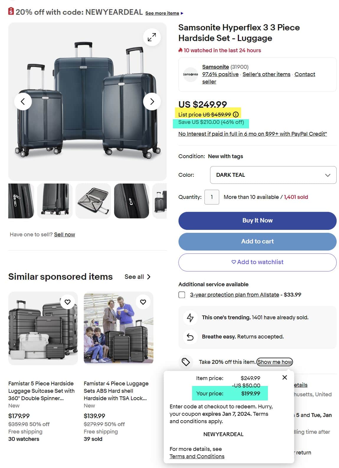 What about this Samsonite luggage set advertised at a 46% discount from supposed "list price" of $459.99 plus an "extra" 20% off, bring the total down to $199.99?