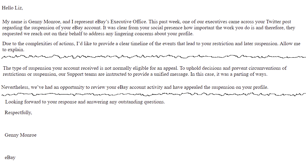 Reaching out like eBay has done here with a request to review and verify activity on the account should be the standard course of action, not something reserved only for people with enough social presence to capture eBay executive attention.