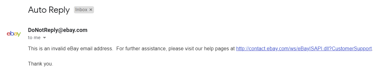I attempted to reply back to Genny with those concerns and an offer to speak to her or anyone in eBay's security or risk departments about these issues but unfortunately, the email address from which her message was sent apparently doesn't accept replies. 🤦♀️