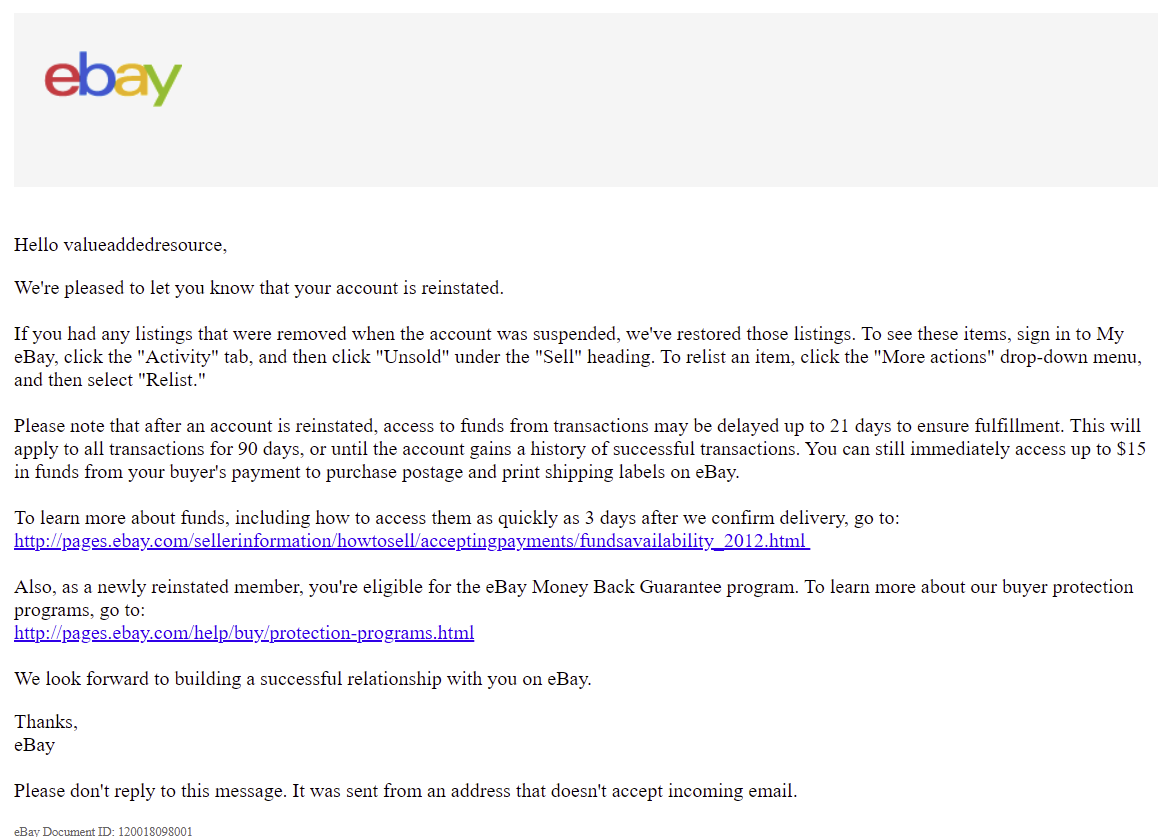 And most importantly - if there really was a risk to the eBay community posed by this account, why was it reinstated with no verification or appeal required?