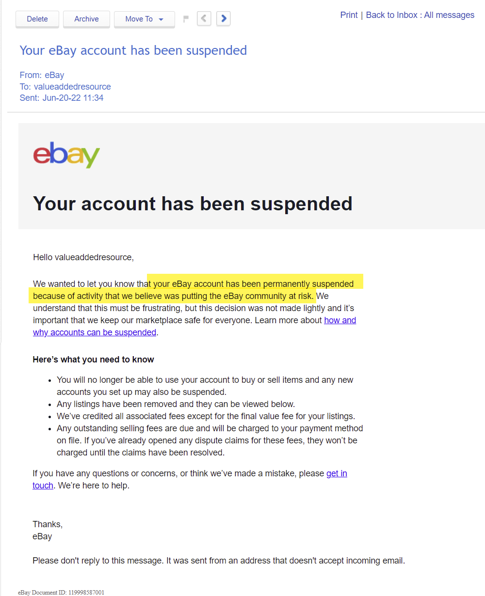 The account I have used for over 2 years to participate in the eBay community forum has been suddenly suspended permanently with no warning or explanation - just a boilerplate note saying they believe the account was "putting the eBay community at risk." 🤯