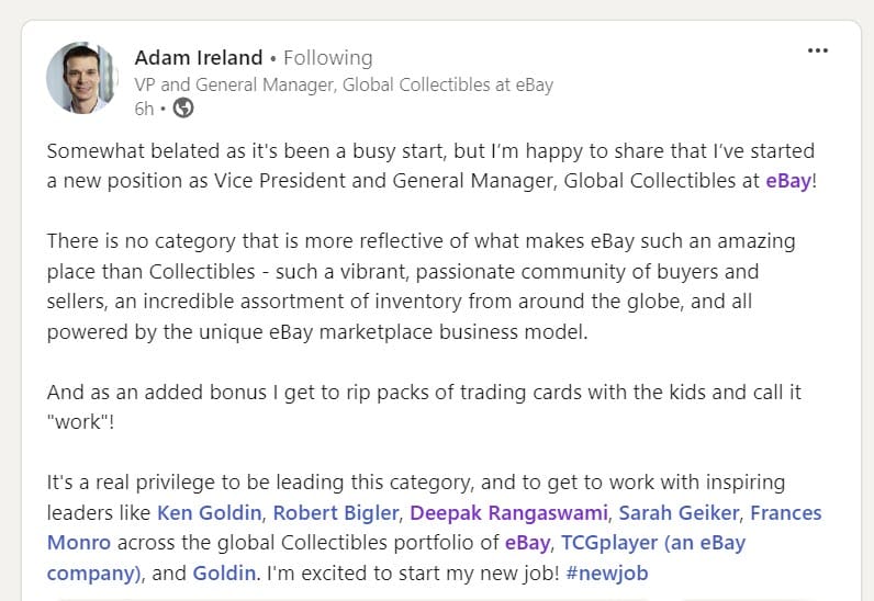 A "somewhat belated" LinkedIn update posted today reveals that he is the new VP Global Collectibles, where he will lead eBay's portfolio in this critical vertical, including TCGPlayer and Goldin.