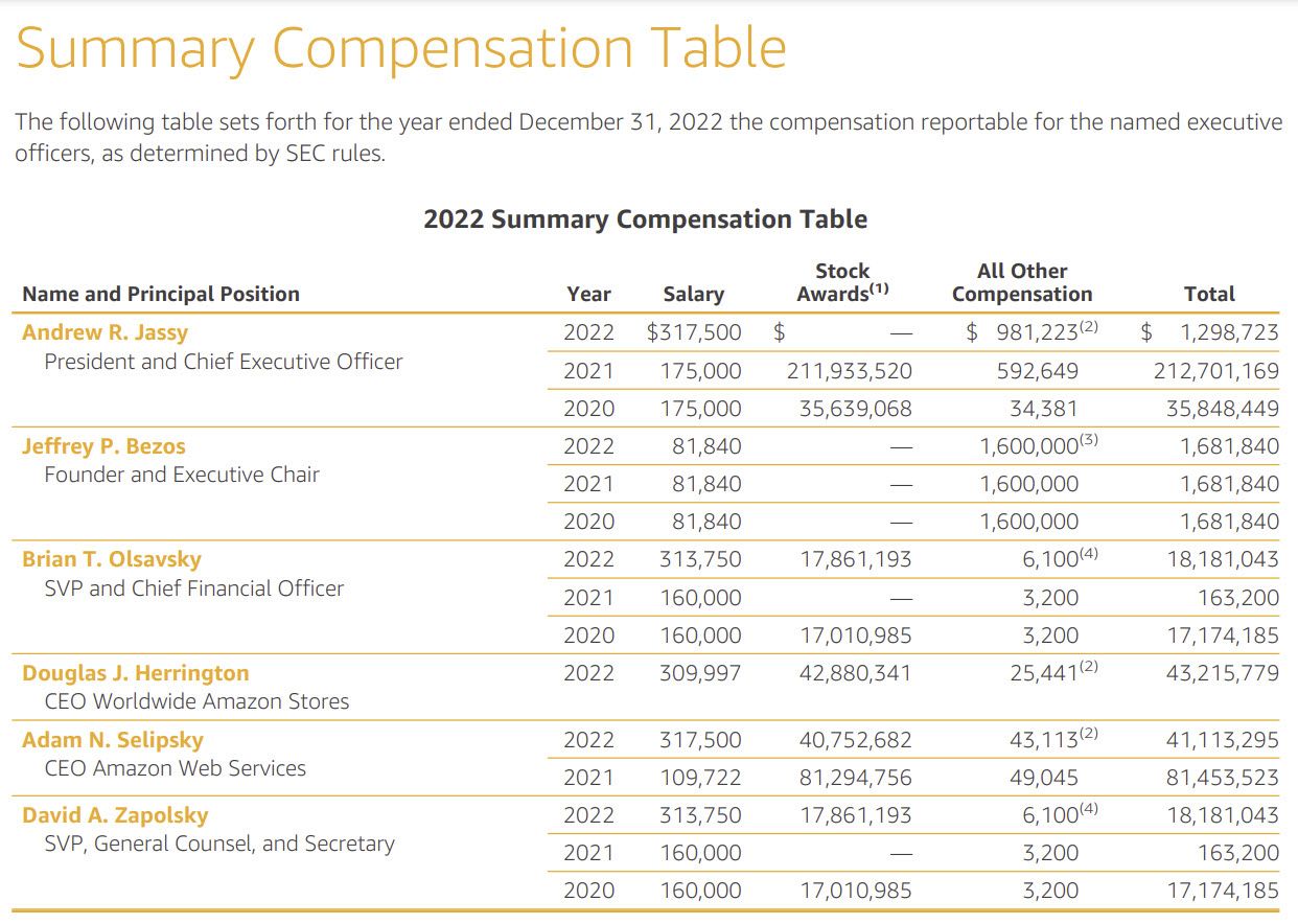 One interesting note - Jassy's compensation for 2022 was significantly down, mostly due to not being granted any equity awards and the decline in value of restricted stock units.