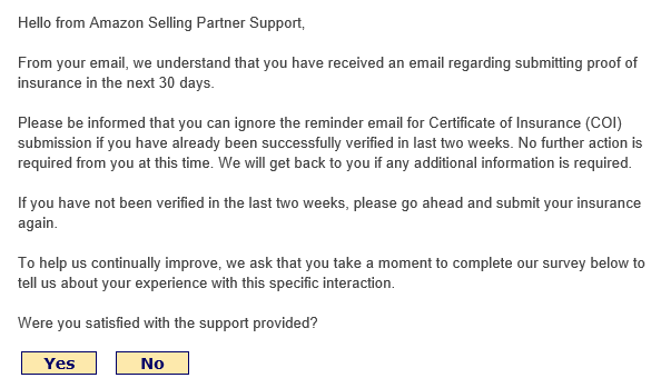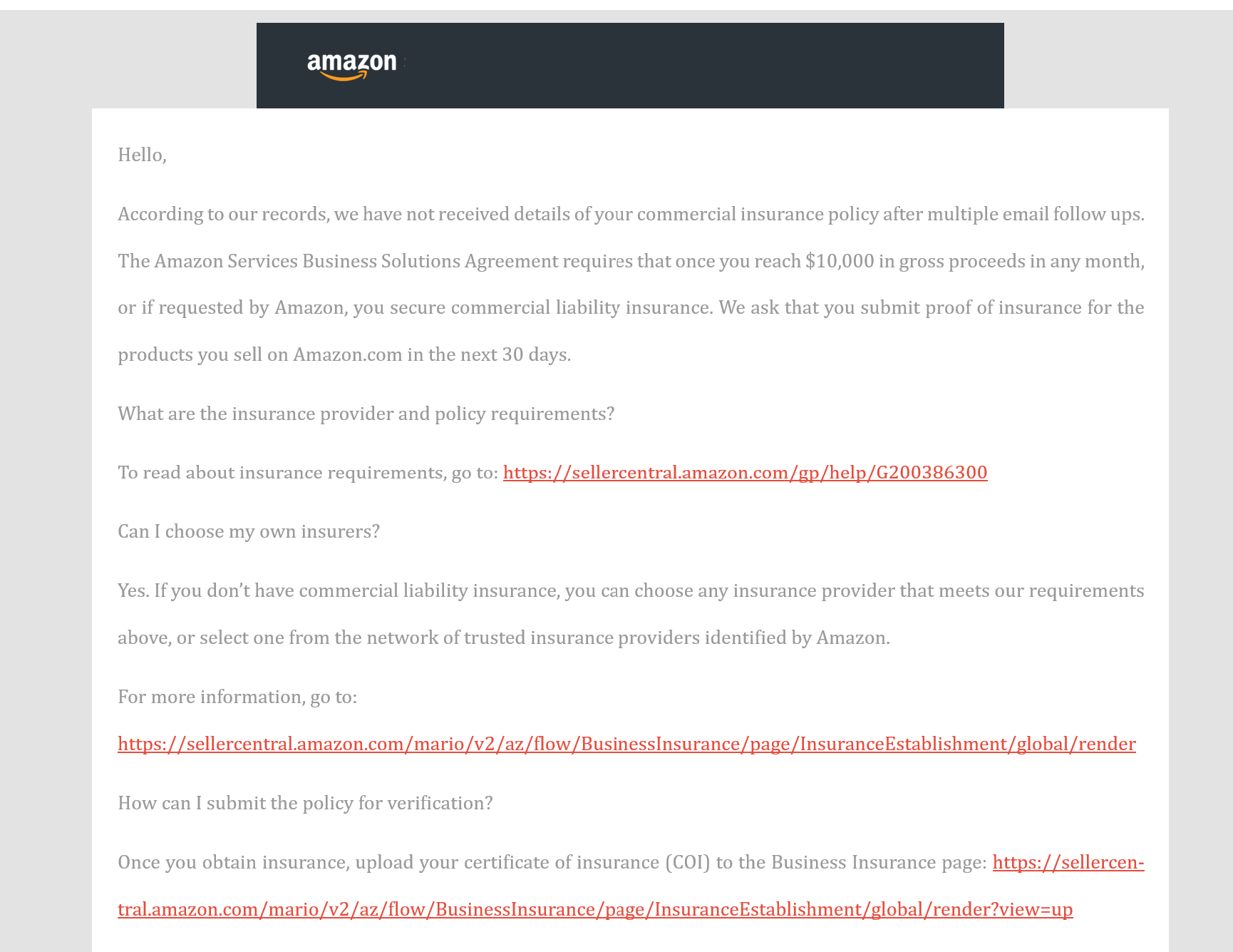 Amazon sellers are scrambling to reupload business insurance information after another "bots gone wild" situation sends warnings in error.