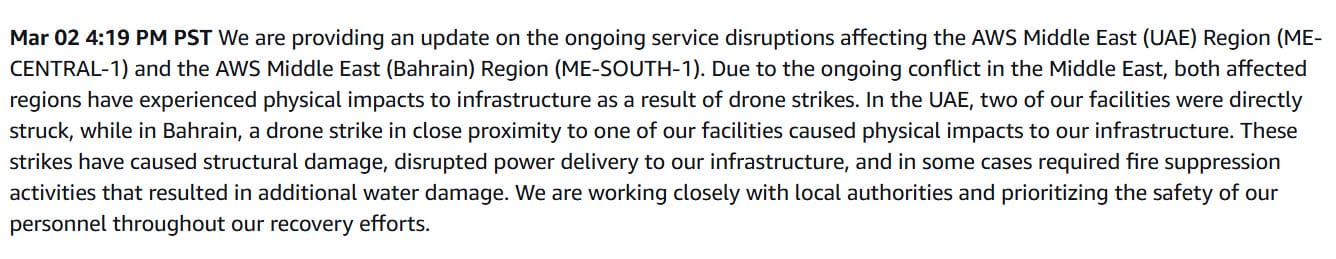 Earlier this week, Amazon reported service disruptions in the Middle East after locations in the area were hit by drone strikes in the ongoing conflict in the region.