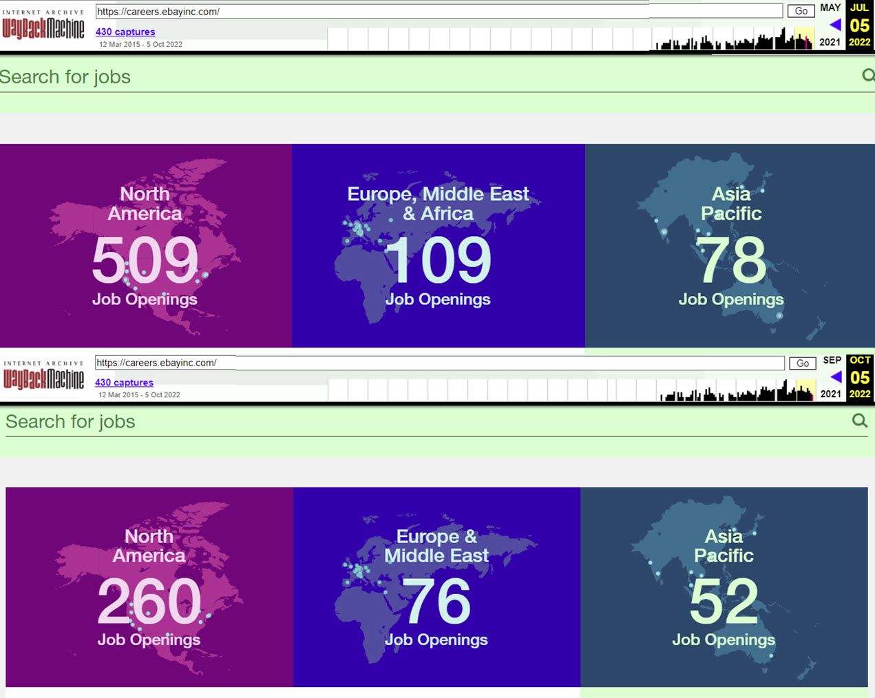eBay has not officially announced a hiring freeze, but open job positions listed on the company's career page have fallen significantly in the last 3 months, from a high of 696 in July to 388 today, with the bulk of the removed positions being based in North America.