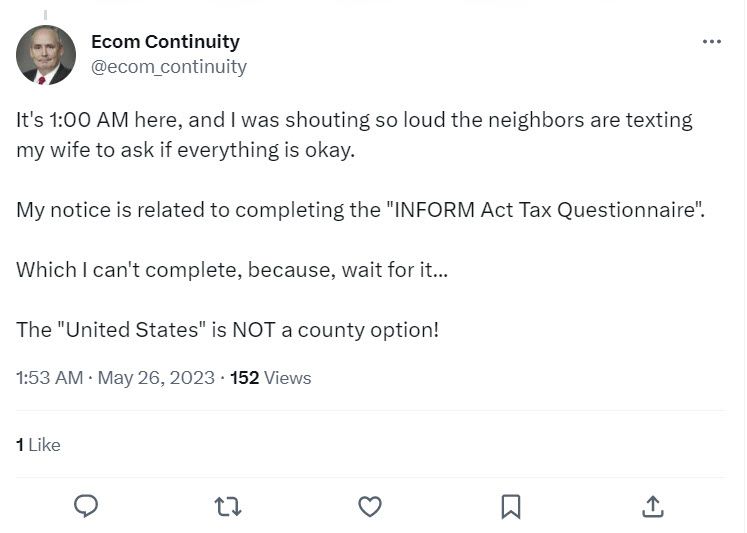 Even worse - some sellers noticed they couldn't comply with the request because....the United States wasn't even an option in Amazon's dropdown menu for countries.