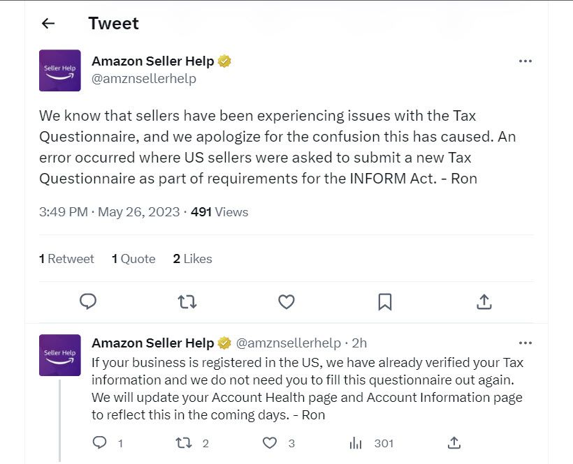 Amazon Seller Help has posted an update stating the request to submit a new tax questionnaire was an error and seller whose tax information has already been verified do not need to fill it out again.