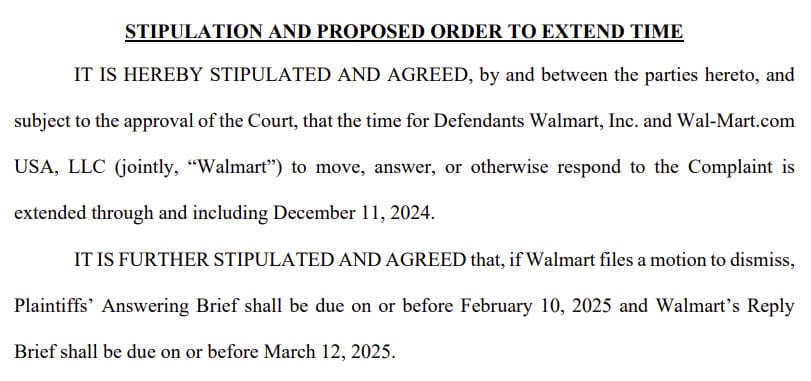 Both parties have agreed to a stipulation allowing Walmart extended time to respond to the complaint, likely pushing any further updates to December and into 2025.