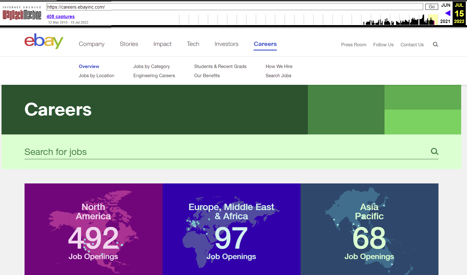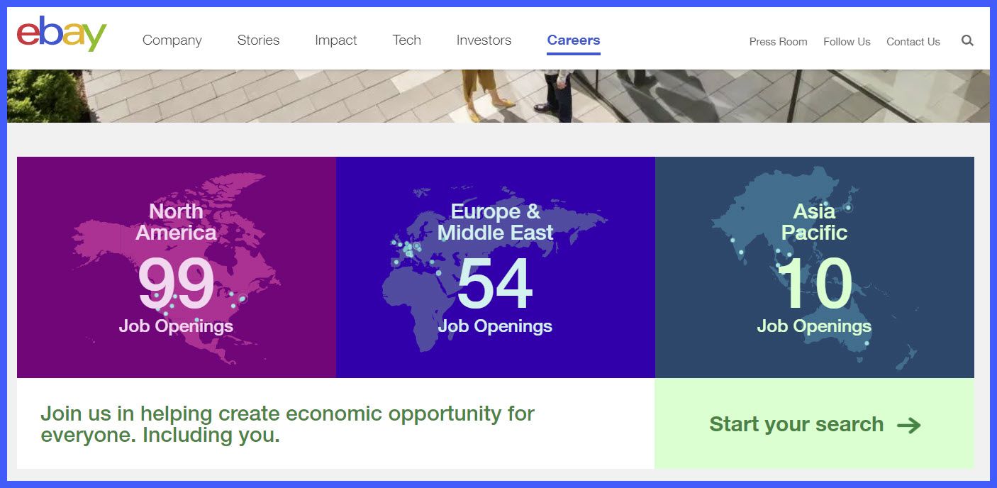 On October 24, the last day the regional breakout was shown, eBay had 106 jobs in North America, 48 in Europe and the Middle East, and 25 in the Asia Pacific Region.