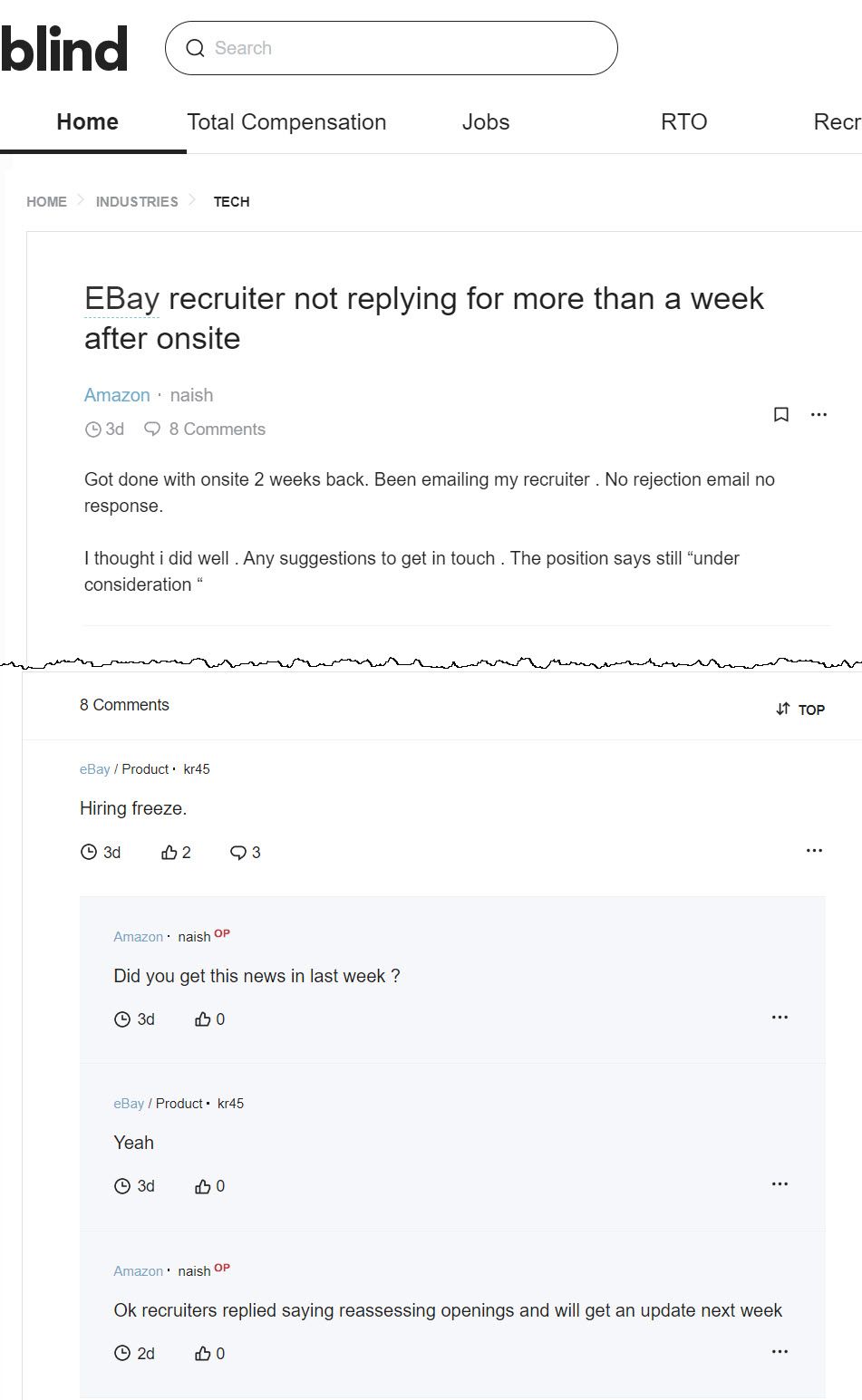 And anonymous reports continue on Blind that eBay may have frozen hiring in some departments.