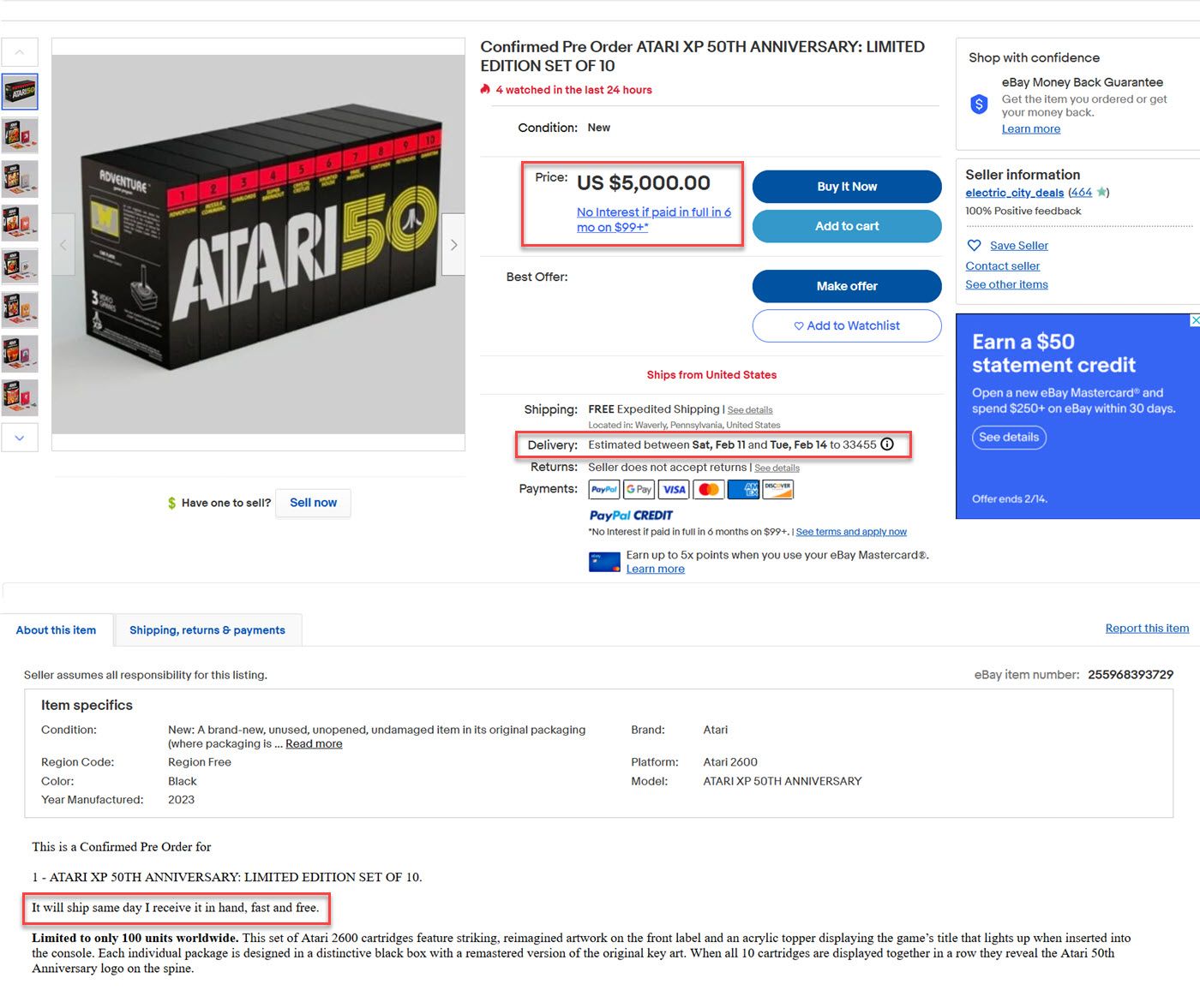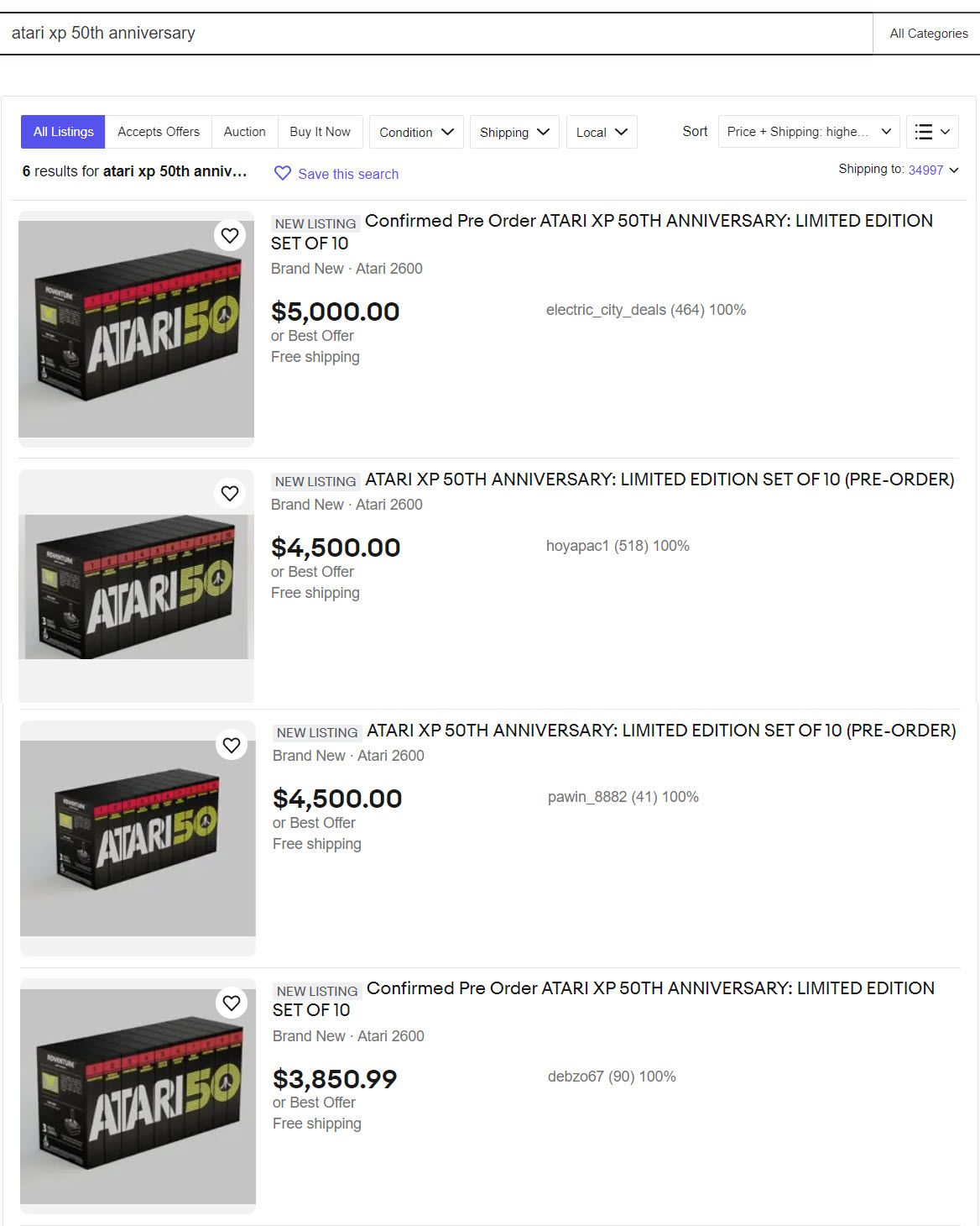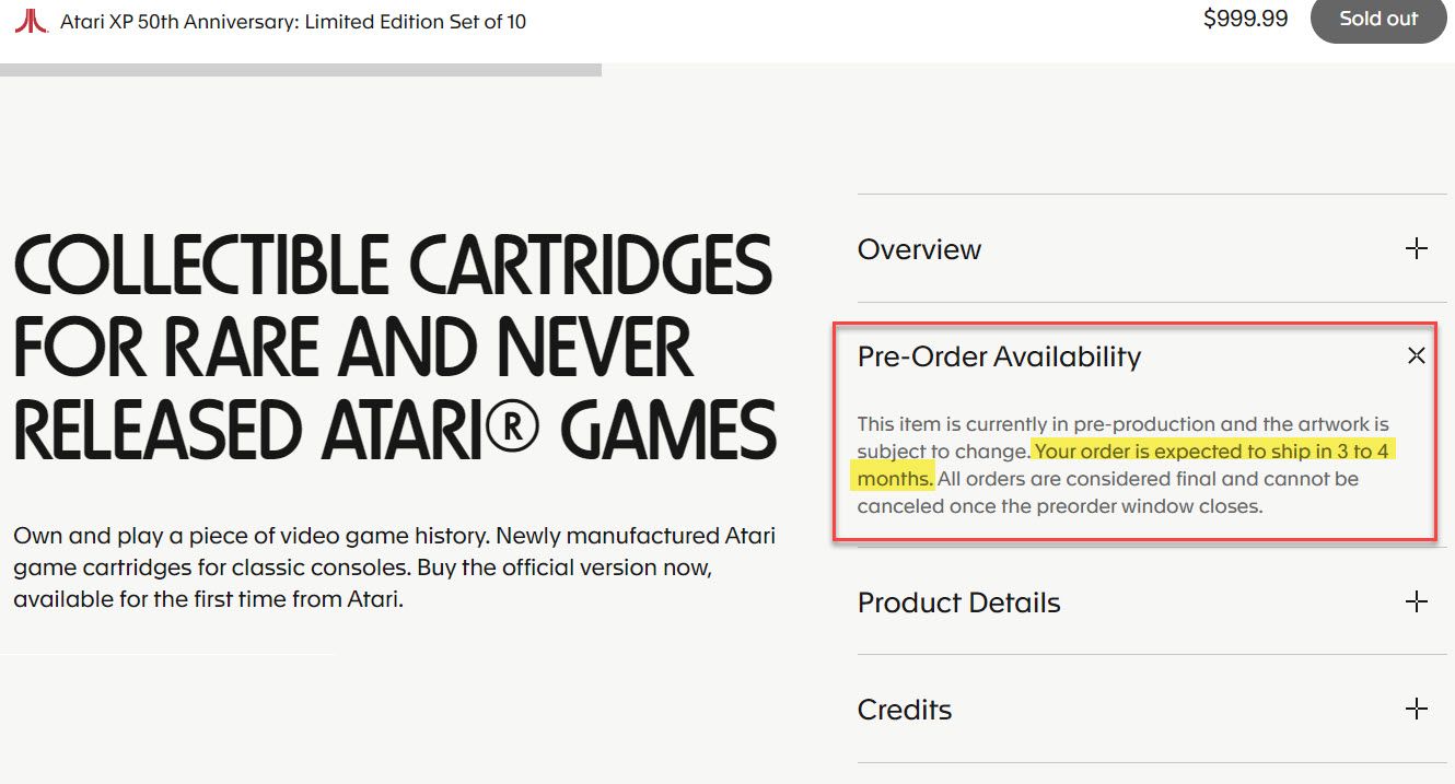 Every listing for the Atari XP 50th Anniversary set violates eBay's presale policy by virtue of the 3-4 month wait time, not to mention the fact that Atari themselves say the artwork "may change" during production so it's a possible Not As Described case in the making (assuming anyone who buys it on eBay ever actually receives anything, which is not likely.)