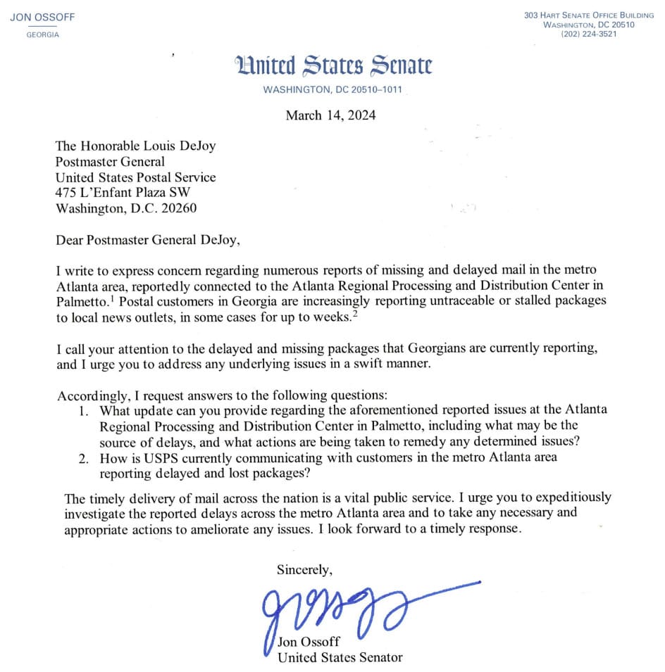 United States Sen. Jon Ossoff (D-Ga.) has launched an inquiry into what's going on at the postal facility in Palmetto, GA demanding answers as to what's causing delays and what actions are being taken to resolve the issues.