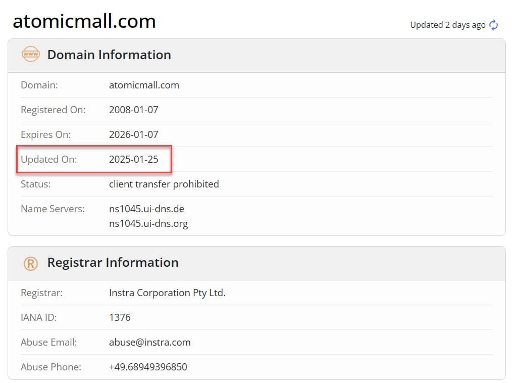 WhoIs records for the AtomicMall.com domain are mostly private, but it does show there was an update on January 25th, 2025.
