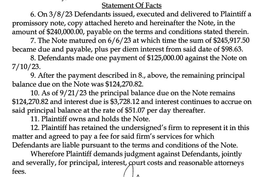 On 3/8/23 Defendants issued, executed and delivered to Plaintiff a promissory note, copy attached hereto and hereinafter the Note, in the amount of $240,000.00, payable on the terms and conditions stated therein.The Note matured on 6/6/23, at which time the sum of $245,917.50 became due and payable, plus per diem interest from said date of $98.63.