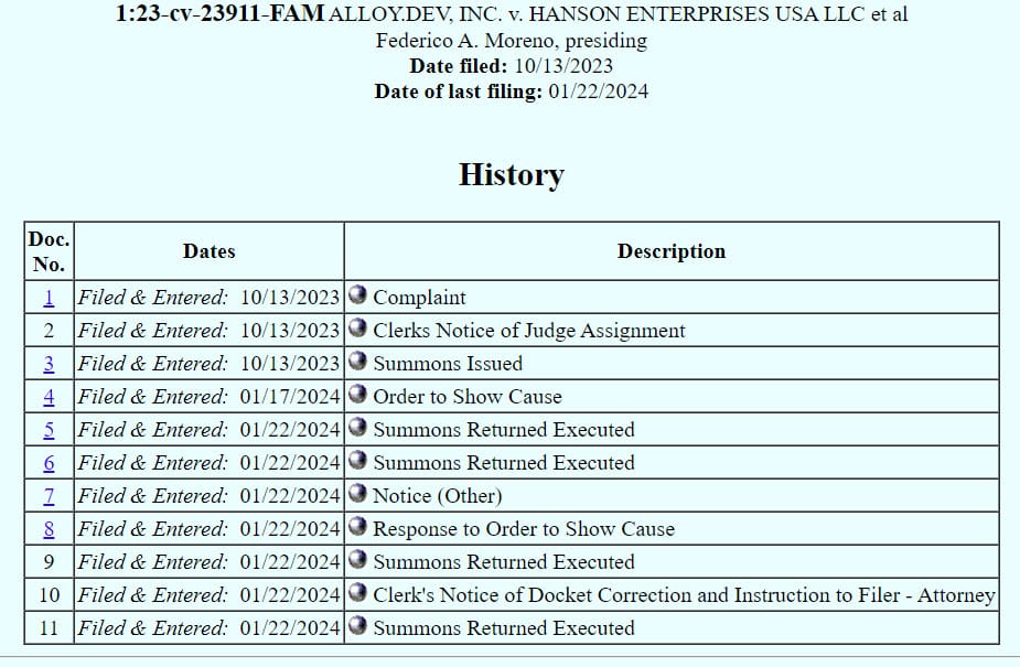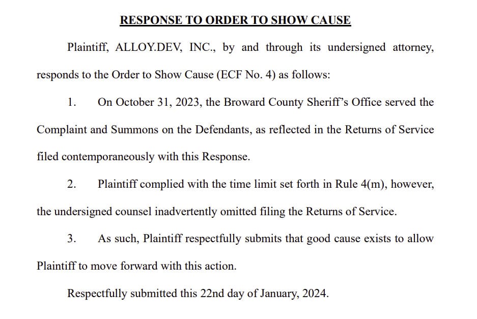 Court records show Faison was successfully served in this suit on October 31, but Alloy.Dev, Inc's attorney omitted filing the Returns of Service with the court until January 22, 2024.