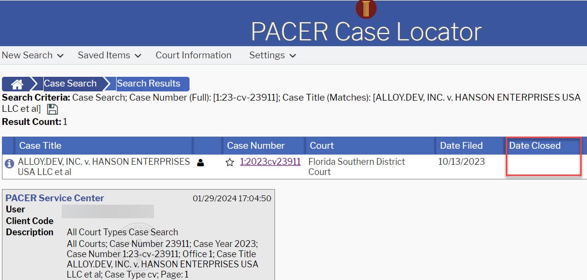 However, PACER still shows the case is currently open as of 5 PM Eastern Time, January 29, 2024, with the latest filing showing on January 22, 2024.
