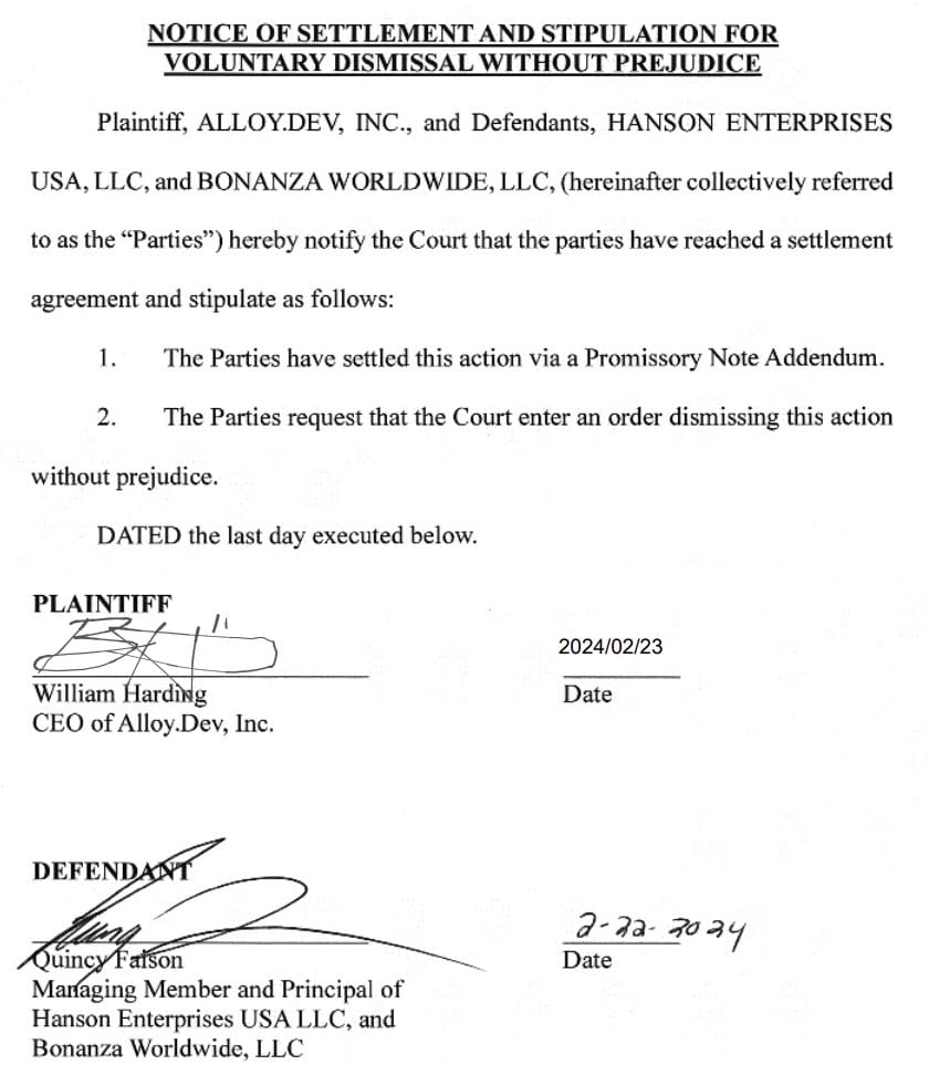 The case between Alloy Dev and Bonanza Worldwide has finally been officially dismissed, with an addendum made to the Promissory Note executed 2-23-24.