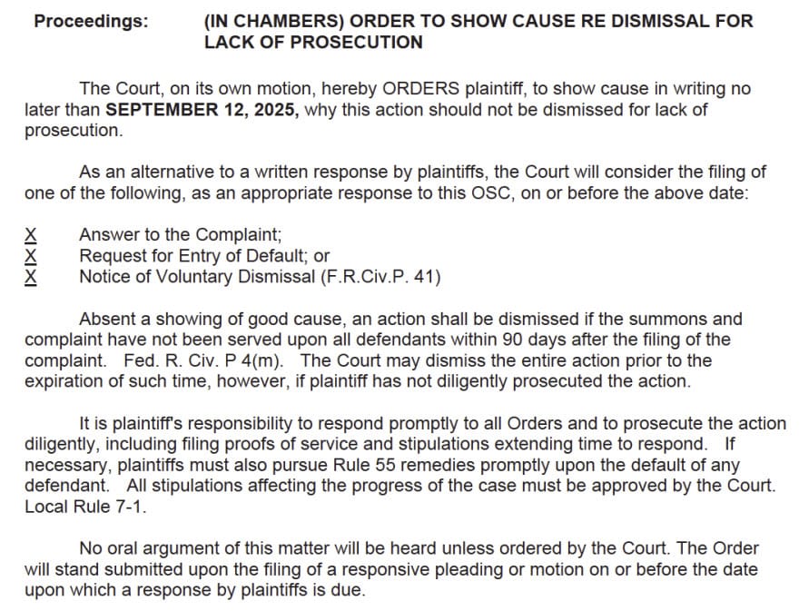 But inexplicably they have yet to do so, resulting in Judge Josephine L. Staton issuing an order demanding that either a response to the original complaint, a notice of voluntary dismissal or request for entry of default be filed by September 12th or else she will dismiss the lawsuit herself.