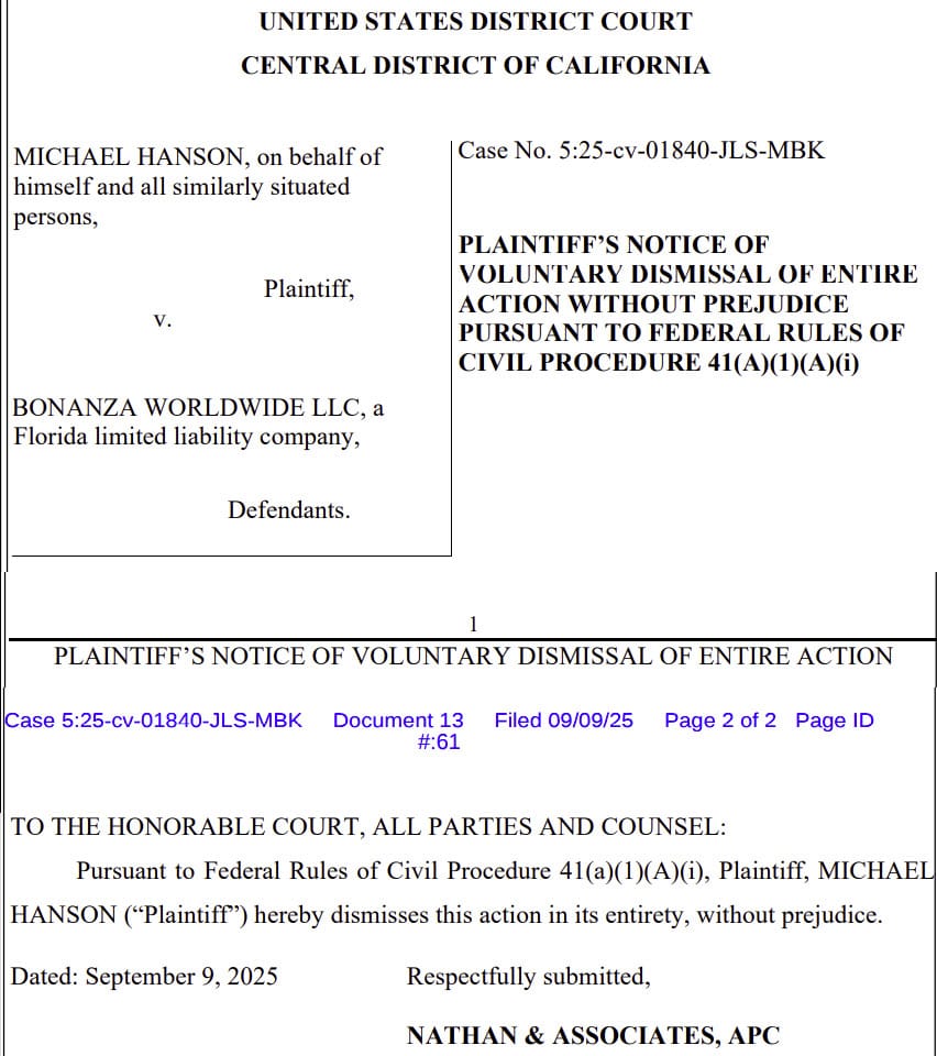 After Bonanza failed to respond before the September 2, 2025 deadline, lawyers for Mr. Hanson have now filed for voluntary dismissal of their own lawsuit.