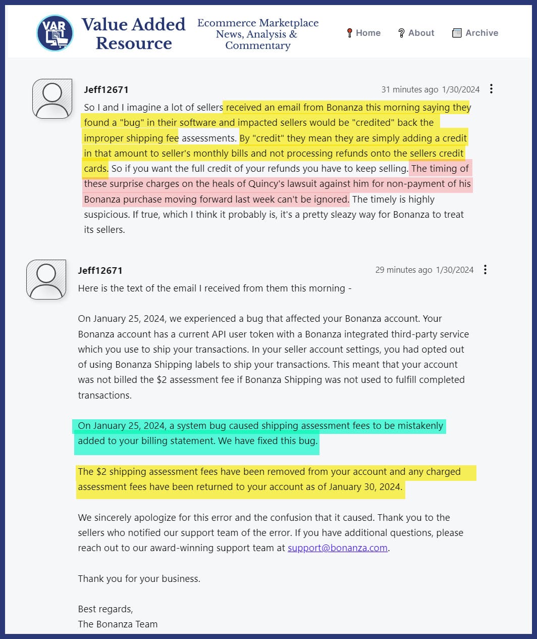 Bonanza has also now posted a statement in their community, while deleting the previous community posts from sellers about this issue - clearly signaling they did not learn anything from the debacle that ensued when they censored comments about the shipping policy announcement back in November.