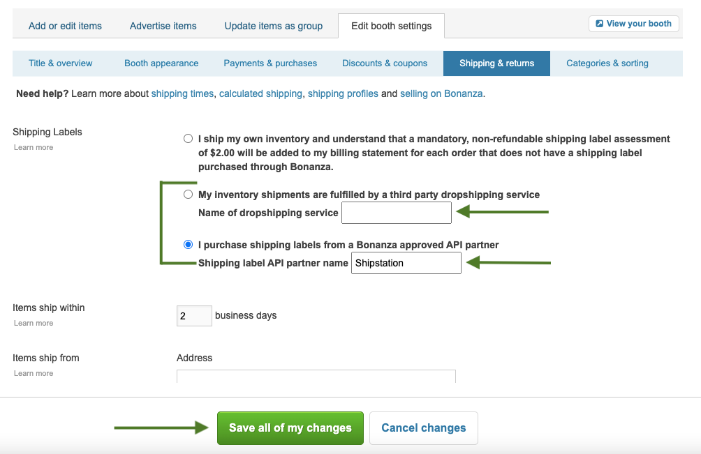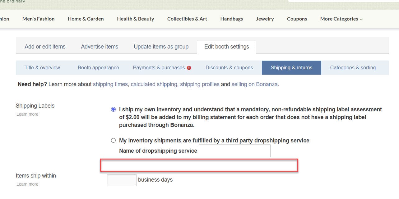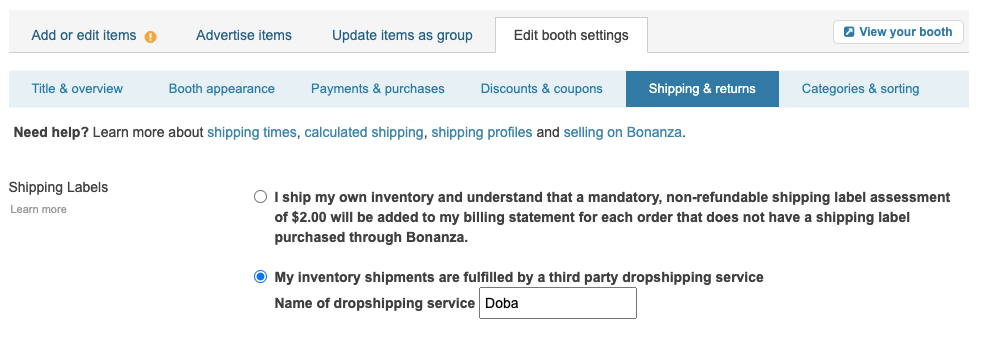 If you meet the exemption criteria outlined above, you can opt-out of Bonanza Shipping from your "Selling > Booth settings > Shipping & returns" page. Select the "My inventory shipments are fulfilled by a third party dropshipping service" then enter the name of the service you are using. Be sure to save the changes before navigating away.Sellers using an approved shipping partner are automatically opted out of the program once they have connected the partner service through the API.