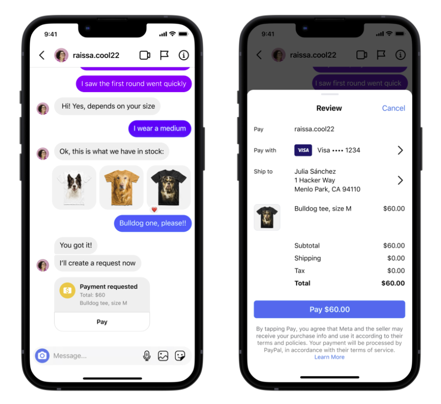 In that same chat thread, you’ll also be able to track your order and ask the business any follow-up questions. Finally, you’ll be able to use Meta Pay to complete purchases, making checkout even easier in just a few taps. And you can shop with confidence knowing that your payments are securely processed and your purchases are protected.