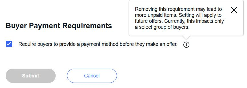 As a seller, if you do not want to require buyers to have to submit payment details before making an offer, here's how you can opt out: