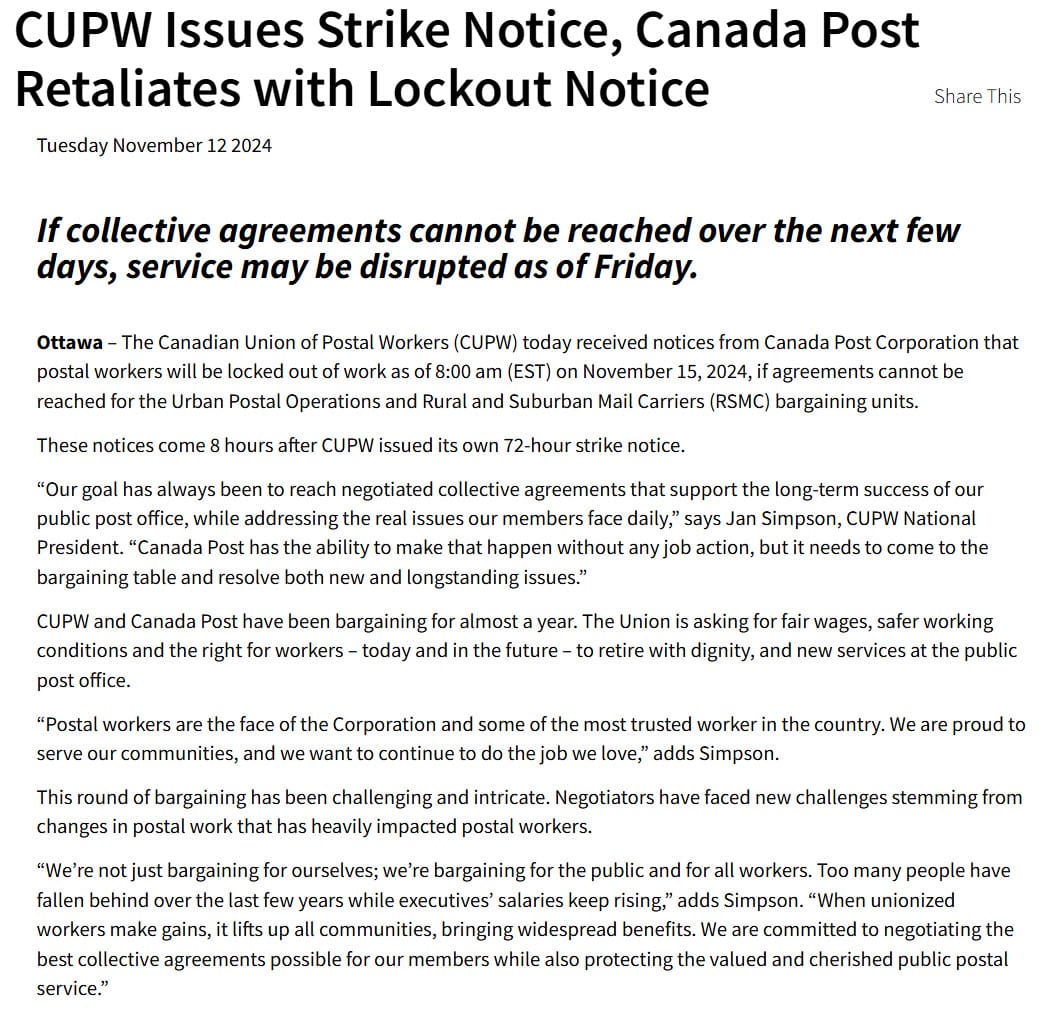 And as bargaining continues, CUPW has reiterated their demands and said they have not (yet) issued a 72-hour strike notice, which means a strike or lockout will not occur on November 3.