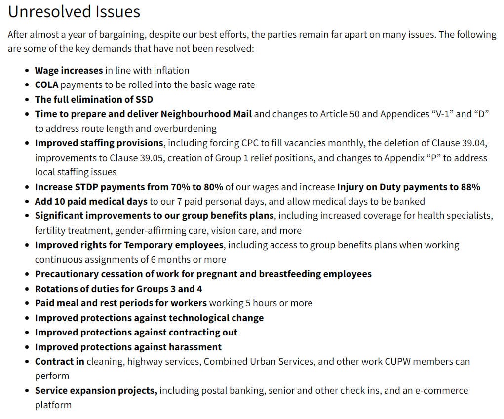 CUPW posted the following list of still unresolved issues on their website, saying they will keep members updated on negotiations and possible strike actions in the days to come