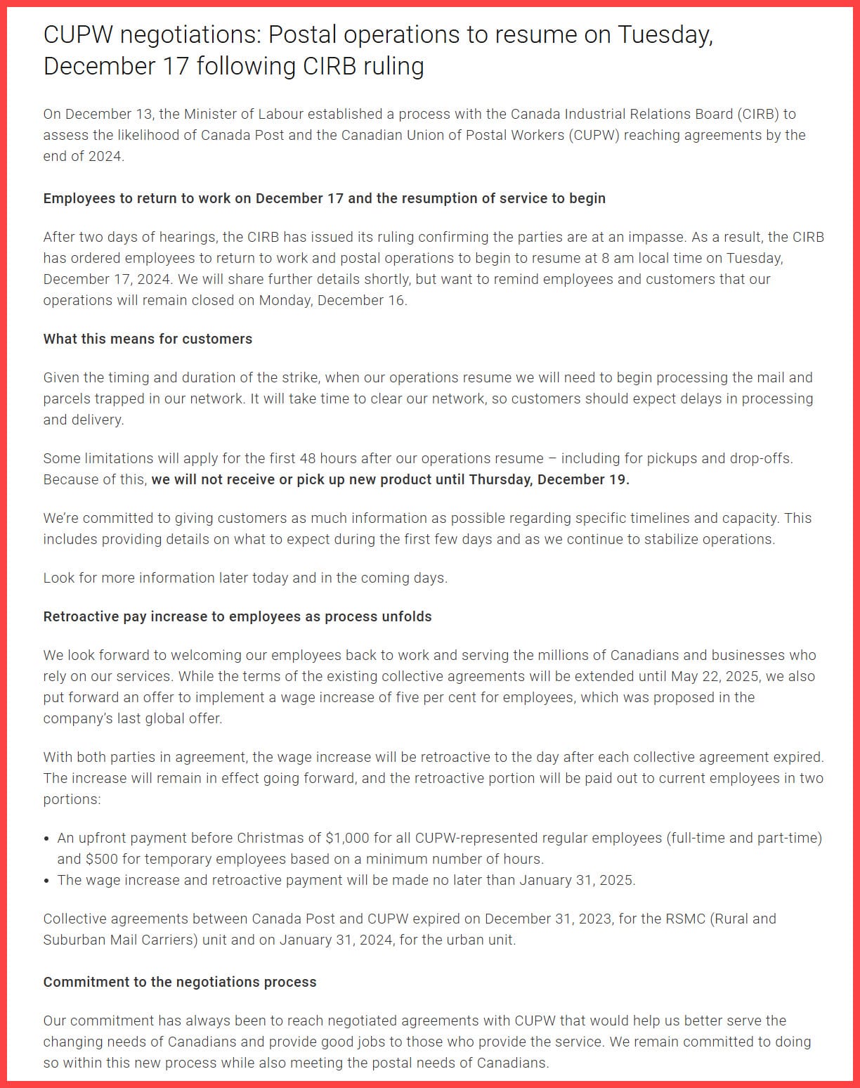 Canada Post operations to resume on Tuesday, December 17 following CIRB ruling.
