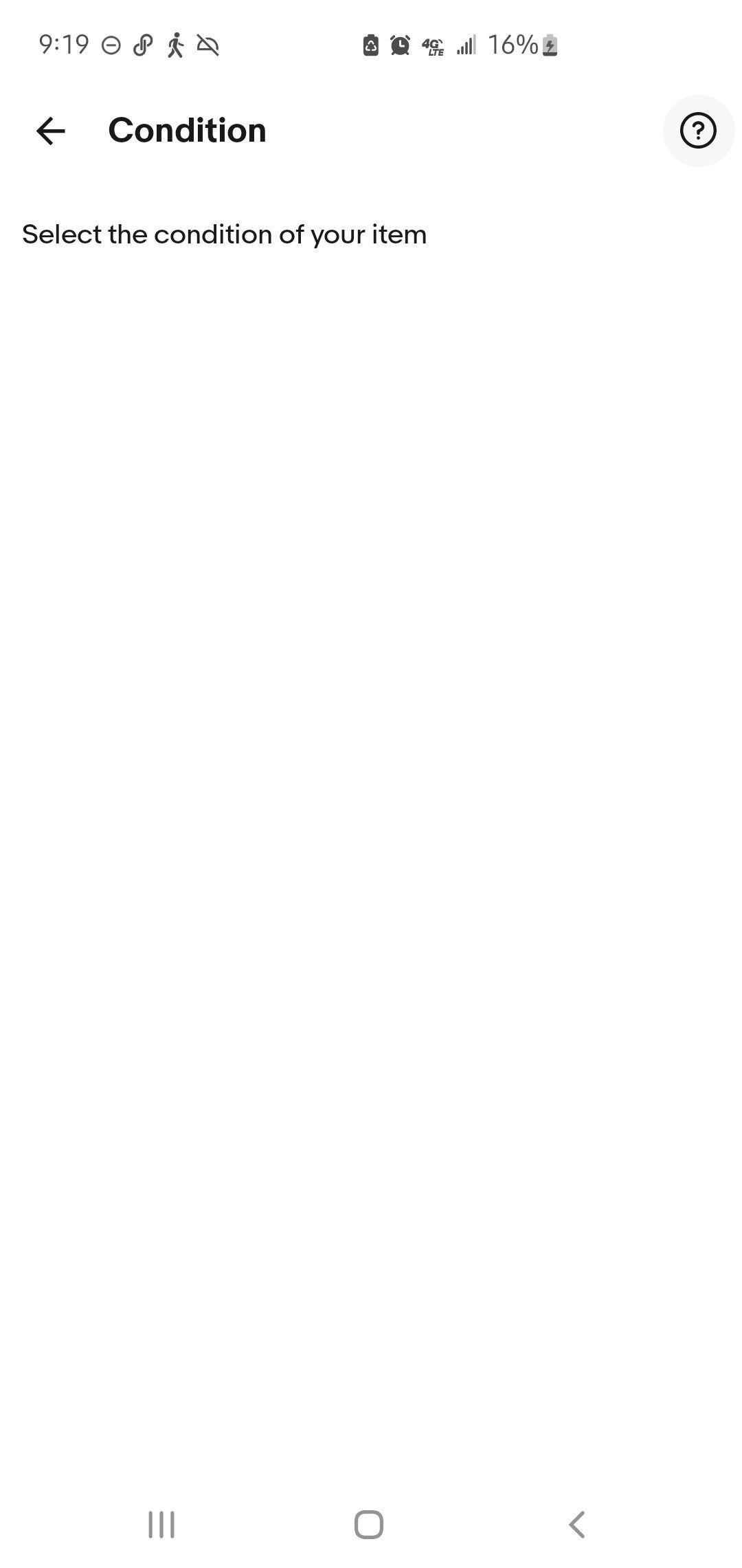This issue just started a few hours ago. Whenever I create a listing using the sell similar option, I have no option to select the condition of the item. It is just blank. I have restarted the app, deleted it and reinstalled.