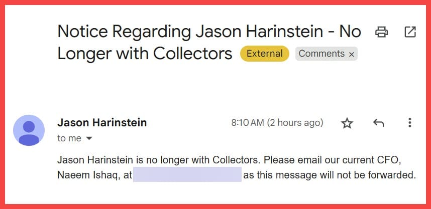 An attempt to contact Harinstein at his previous Collectors email received the following automated response: