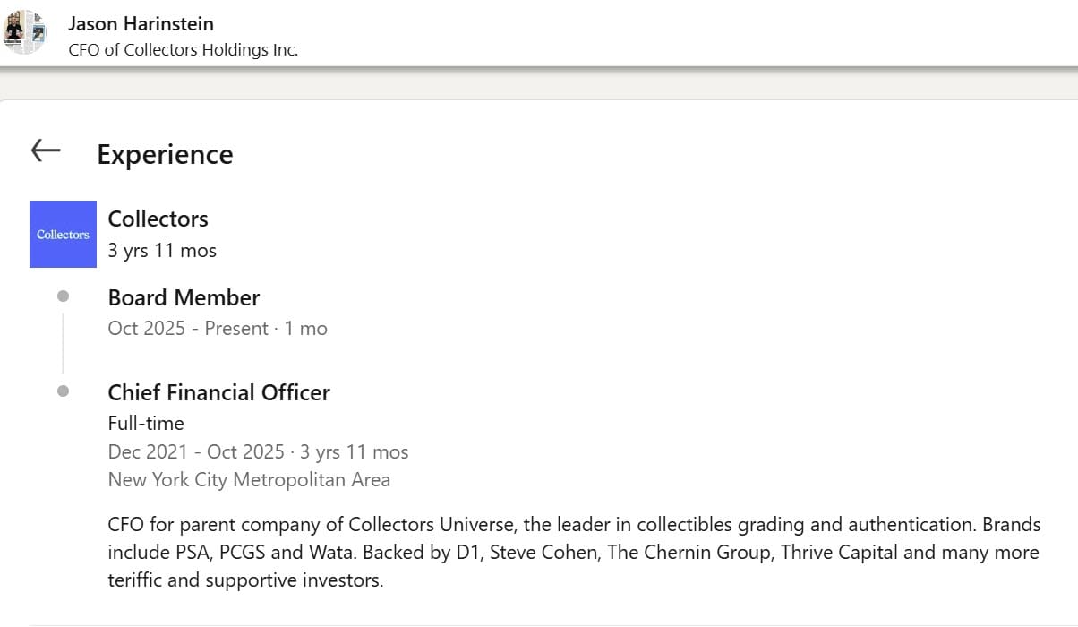 Nat Turner's right hand man appears to have left the Collectors Universe as Jason Harinstein exits the company with Naeem Ishaq taking his place as Chief Financial Officer at PSA parent company Collectors Holdings Inc