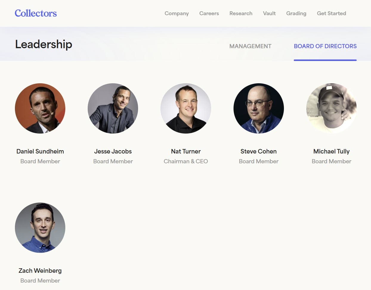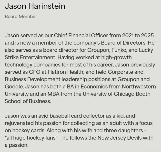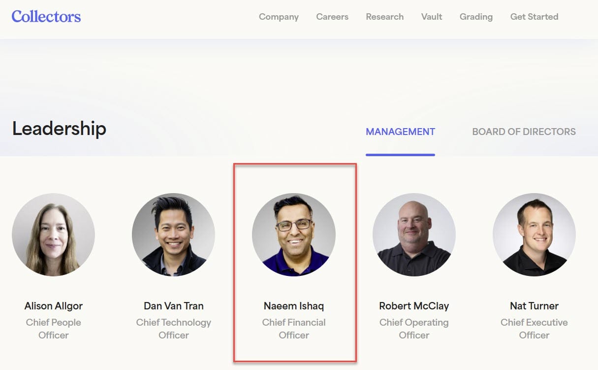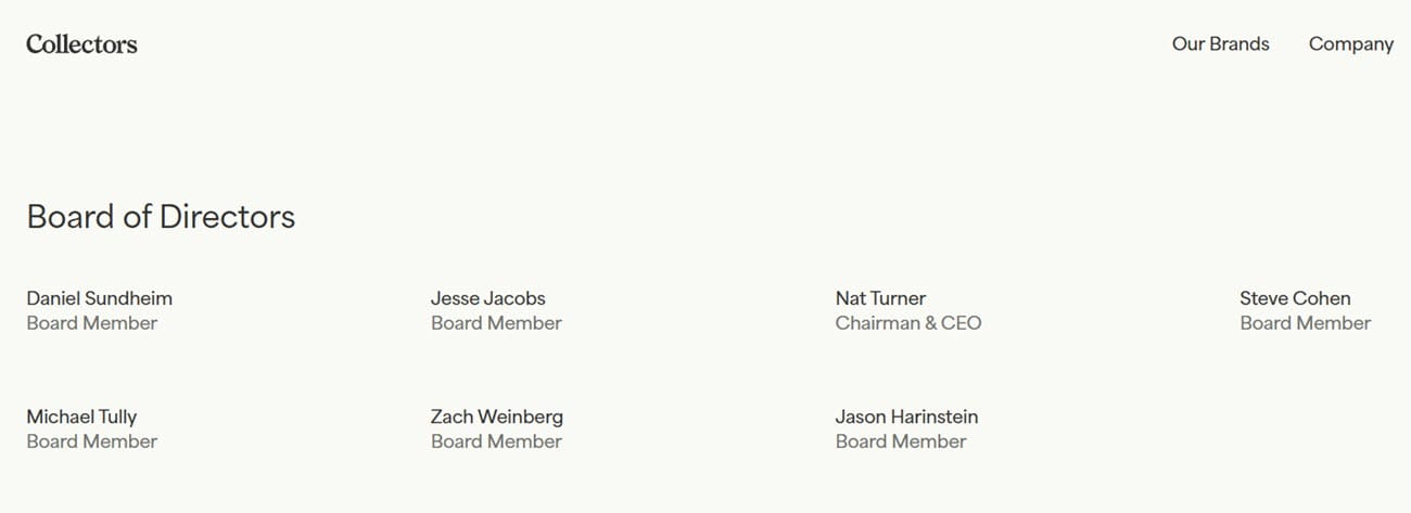 Sometime in the last few weeks, Collectors has changed their leadership page, no longer showing board members on a separate page and officially adding Jason Harinstein to the Board of Directors.