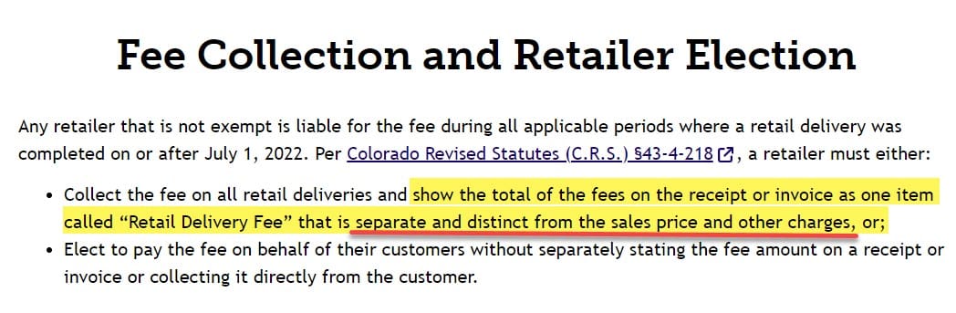 However, if you also operate a stand alone website and have enough sales to Colorado to have nexus and be required to collect and remit sales tax, you will also likely have to start collecting the delivery fee.