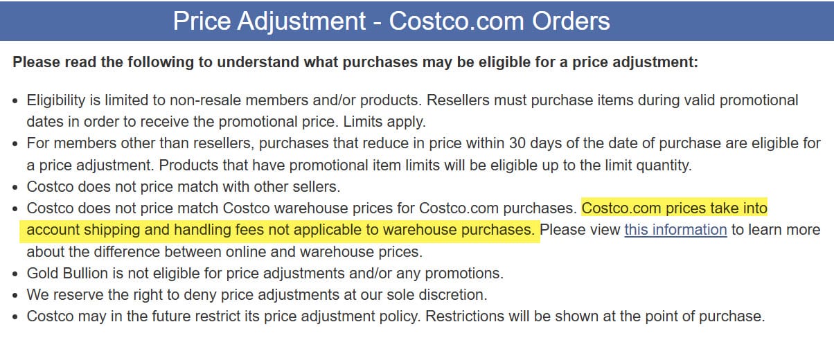 A customer service page on Costco's website acknowledges that online prices “take into account shipping and handling fees not applicable to warehouse purchases.”