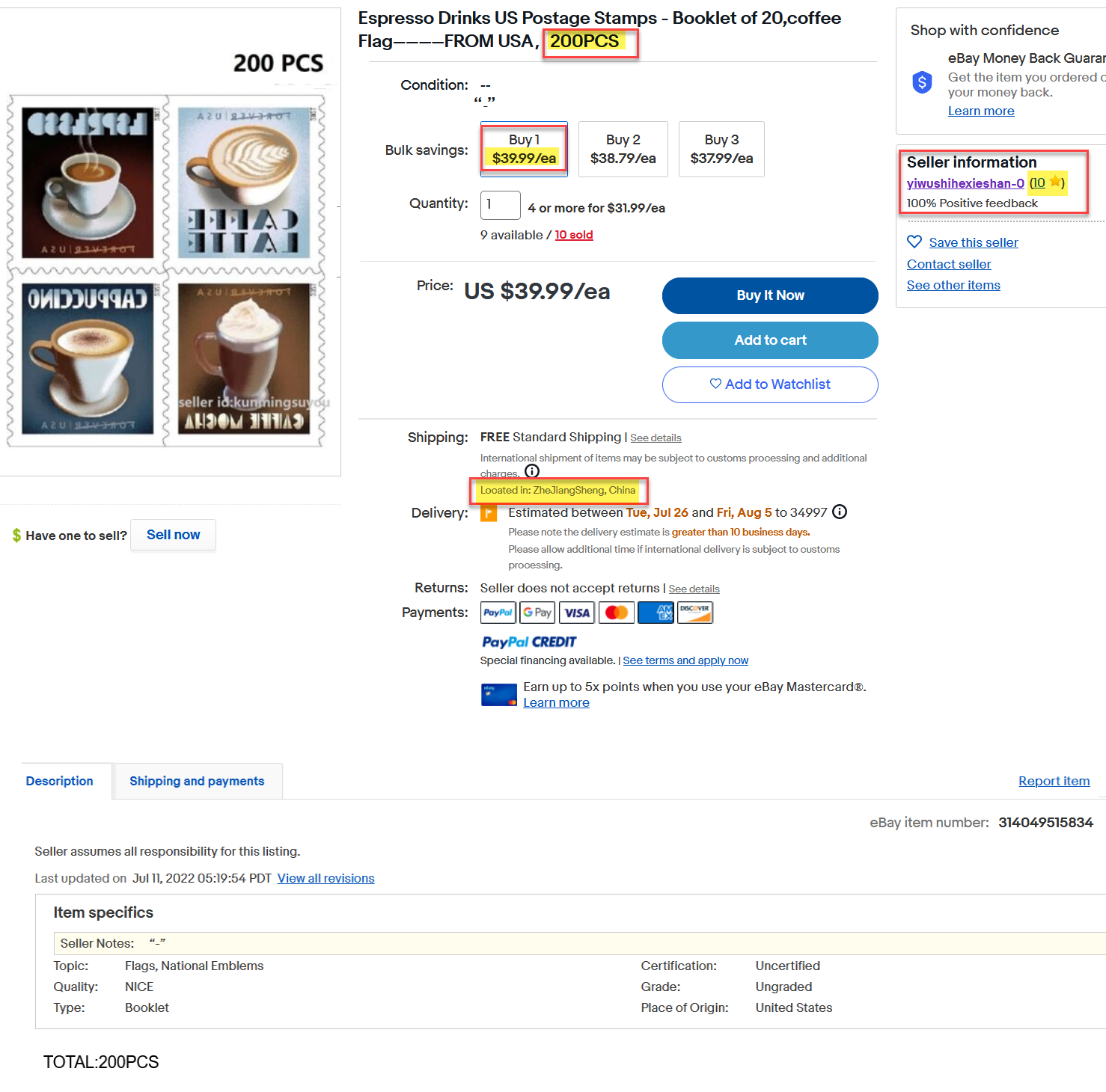 An alert reader sent me this egregious example of a clearly suspicious eBay listing showing 200 Forever Stamps being sold by a low feedback seller in China at a very steep discount that works out to ~$0.20 each.