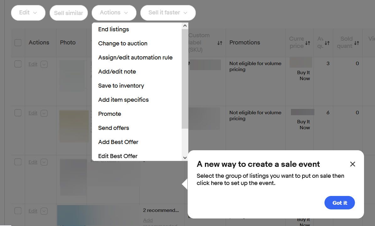 We're working on some new features to make it easier for you to put listings on sale, in sale events directly from the active listings page. Be on the lookout for that.