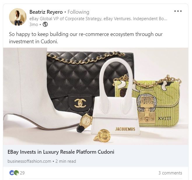 eBay Ventures Global VP Corporate Strategy Beatriz Reyero was also excited about the investment, touting Cudoni as an important piece in building eBay's re-commerce ecosystem.