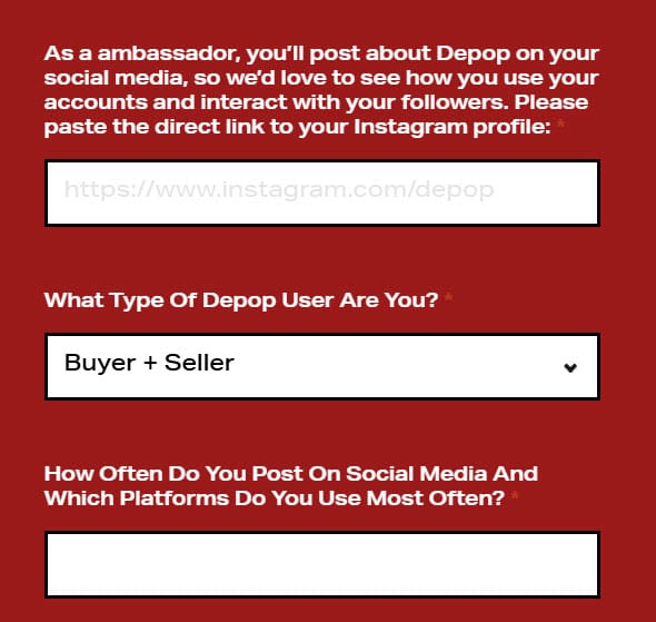 The application form makes it clear this program is currently for the US marketplace only and while their description makes it sound like they will focusing a lot on in person events, the application also reveals they are looking for people with an established social media presence who can help promote the Depop brand and bring an audience with them.