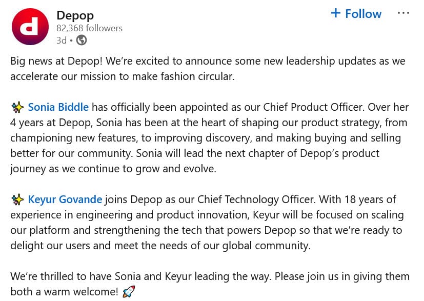 After Colburn's move, Depop decided to split the Product and Technology leadership positions he held into two roles with Keyur Govande, who had been VP Engineering and interim Co-Chief Technology Officer at Etsy moving over to the Depop side as Chief Technology Officer earlier this year.