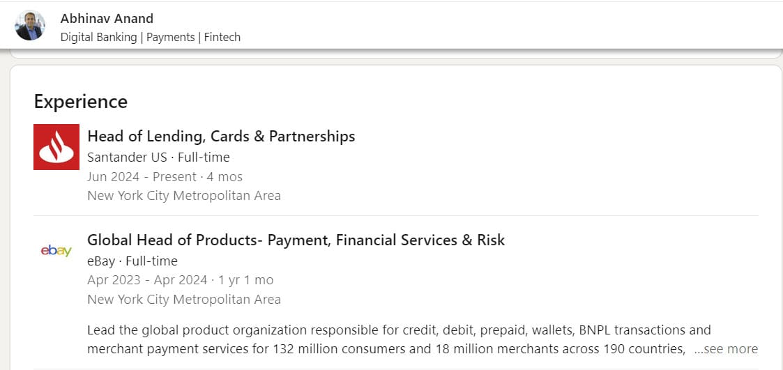 Abhinav Anand's time leading Global Payment Products at eBay apparently came to an end just one year after it started as LinkedIn shows he left the company in April and has moved on to Santander.