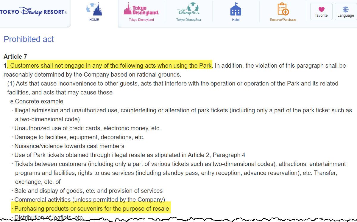 Under Tokyo Disney Resort’s “Theme Park Terms and Conditions” on its website, the Disney theme park notes under “Prohibited Acts” the ban on reselling merchandise.