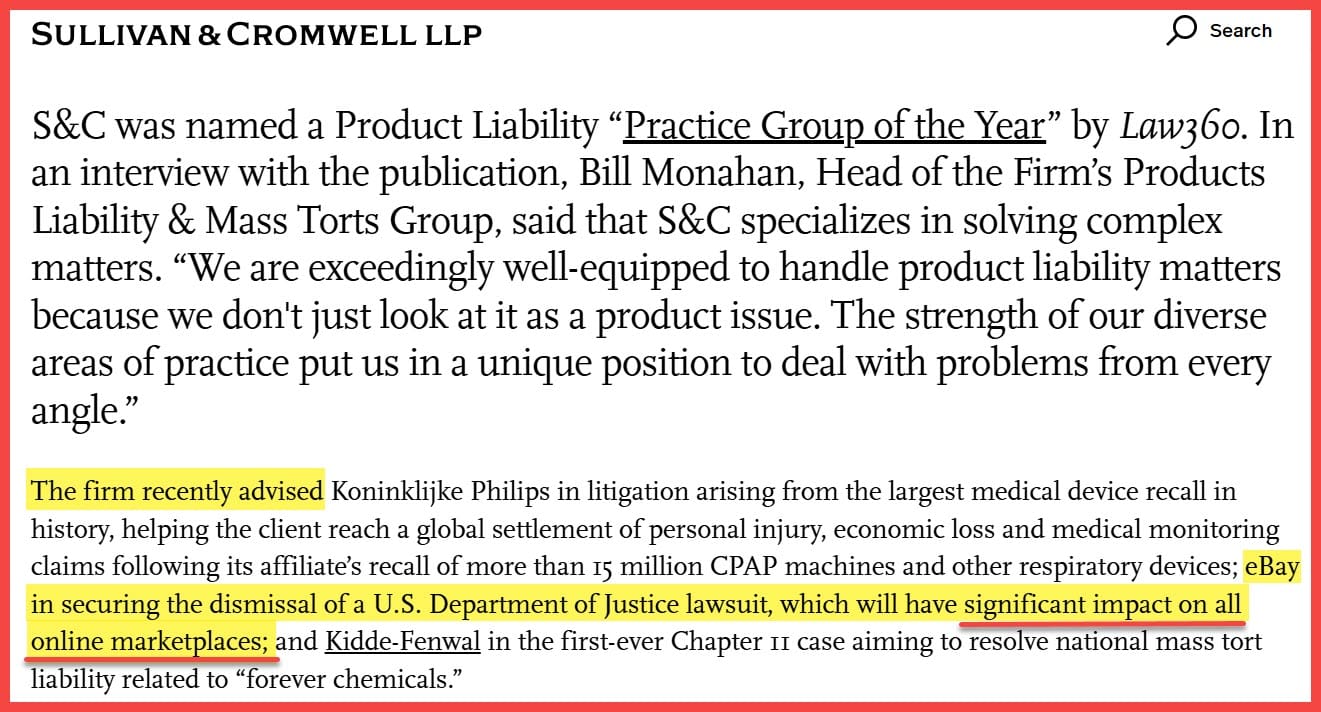 Sullivan & Cromwell LLP were recently named a Product Liability “Practice Group of the Year” by Law360, citing the firms Section 230 win for eBay as one of their crowning achievements that will "have significant impact on all online marketplaces" - and they're not wrong.