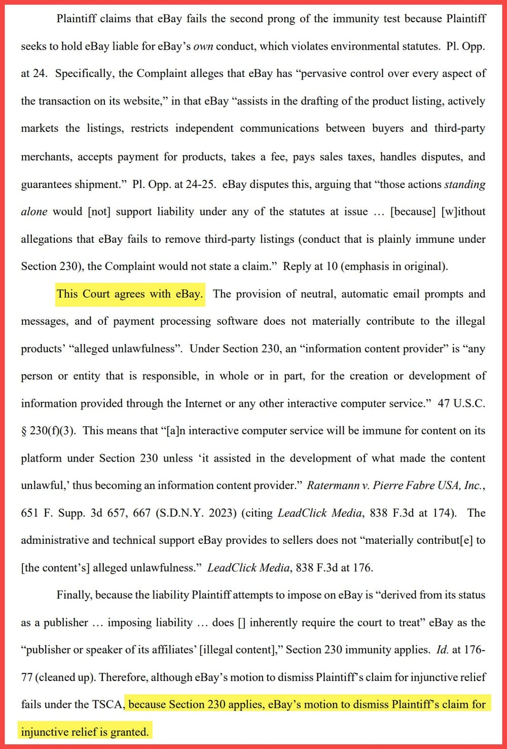 At issue is a Sept. 30 ruling by Judge Orelia E. Merchant which found that section 230 of the Communications Decency Act (CDA) prevents EPA from holding eBay responsible for users’ sales on the marketplace, hinging on a broad reading of the law’s text that “No provider or user of an interactive computer service shall be treated as the publisher or speaker of any information provided by another information content provider.”